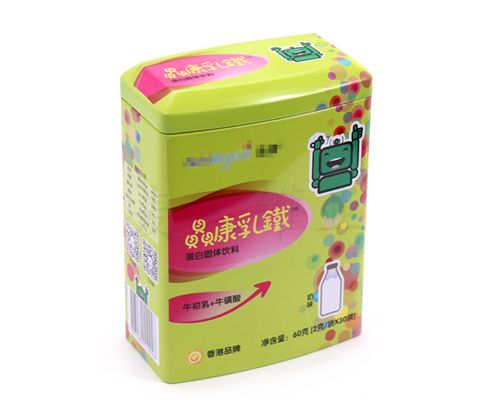 此款多種維生素復合粉馬口鐵罐包裝為經(jīng)典的長方形造型設計,100*60*156mm尺寸,可包裝30g(2gx15袋)不等的多種維生素復合粉產(chǎn)品,能滿足大容量產(chǎn)品包裝需求。為了順應多樣化的市場包裝需求,此款多種維生素復合粉馬口鐵罐包裝可做成正方形、心形、圓形、橢圓形、書本形等異形造型。