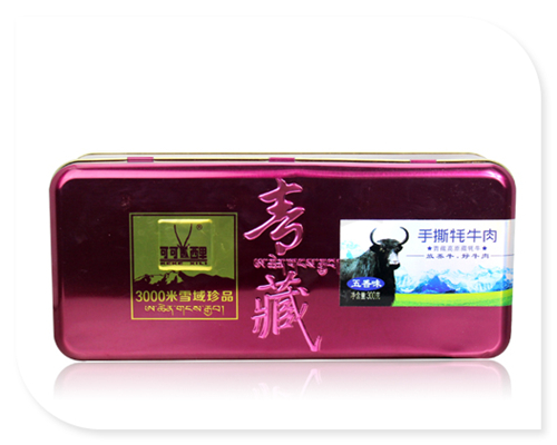 精品藏式牦牛肉鐵盒,結構為三片式天地蓋結構設計,底部為拍底。此款為食品鐵盒,針對食品安全包裝上有著嚴格的要求,鐵盒除了外部天地蓋外,頸線位置有易拉紙蓋設計,目的是為了保證內部環境的干燥度,防止牛肉干受潮變質。