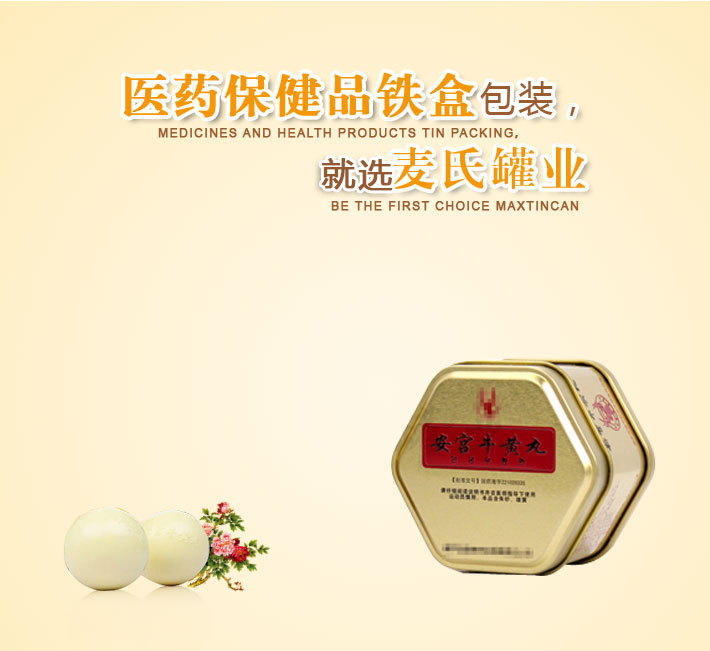 六角形安宮牛黃丸鐵盒,是用來包裝存放安宮牛黃丸的一種金屬包裝鐵盒,印刷美觀,適宜保存,批發價格低,麥氏罐業可定制各種尺寸相關六角形安宮牛黃丸鐵盒,是牛黃丸包裝盒生產加工廠家。