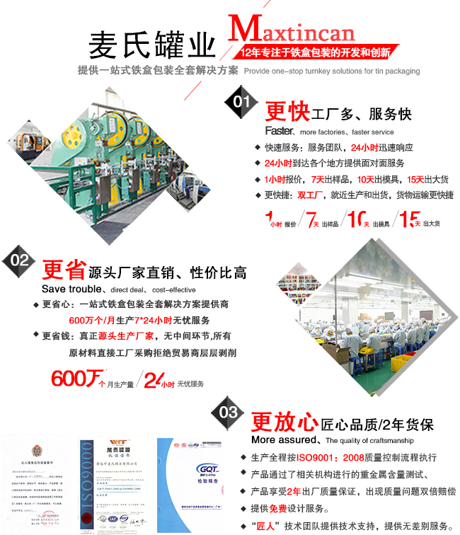 此款鹿角膠馬口鐵盒所采用的材質、油墨、配件等產(chǎn)品均為綠色環(huán)保材料,,產(chǎn)品曾多次通過機構認證檢測,其中包括:FDA、SGS、LFGB等,鐵盒從生產(chǎn)到出庫,全程無塵車間制作,QC全檢,保證每一款鐵盒都標準、安全。真正打造國內鐵盒包裝品牌。